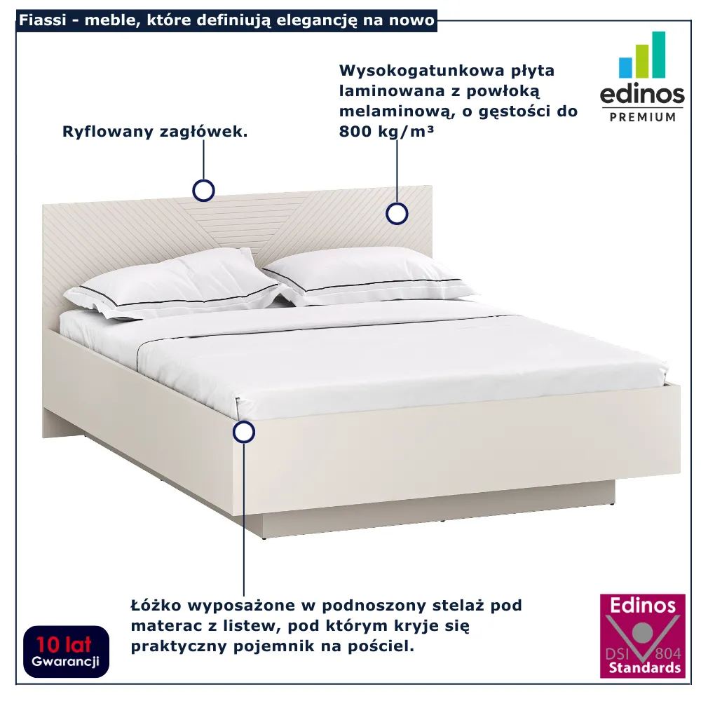 • Produkt posiada certyfikat jakości "Edinos Standards DSI 804", który potwierdza najwyższą jakość wykonania mebla oraz pełny stopień zgodności poszczególnych jednostek wytworzonego wyrobu z przyjętym wzorcem.