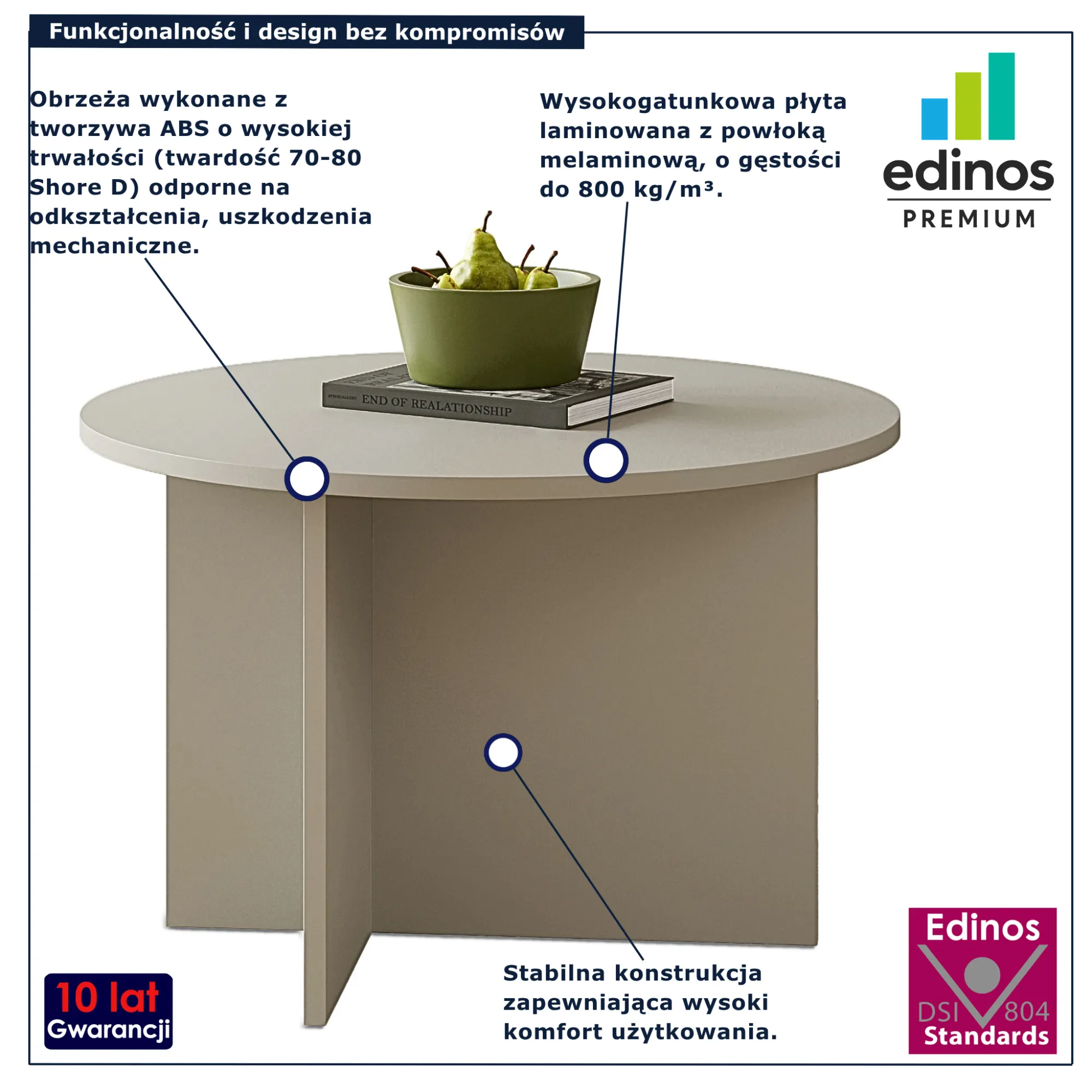 • Produkt posiada certyfikat jakości "Edinos Standards DSI 804", który potwierdza najwyższą jakość wykonania mebla oraz pełny stopień zgodności poszczególnych jednostek wytworzonego wyrobu z przyjętym wzorcem.