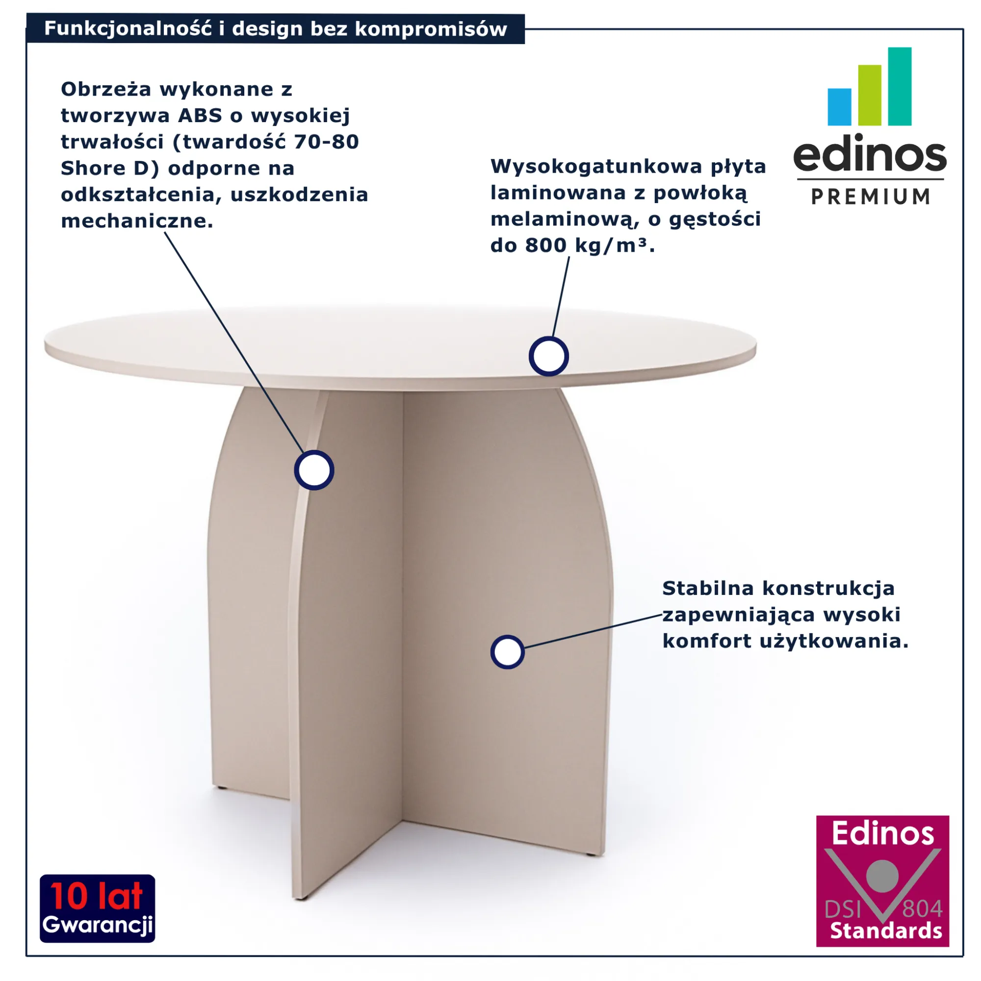• Produkt posiada certyfikat jakości "Edinos Standards DSI 804", który potwierdza najwyższą jakość wykonania mebla oraz pełny stopień zgodności poszczególnych jednostek wytworzonego wyrobu z przyjętym wzorcem.