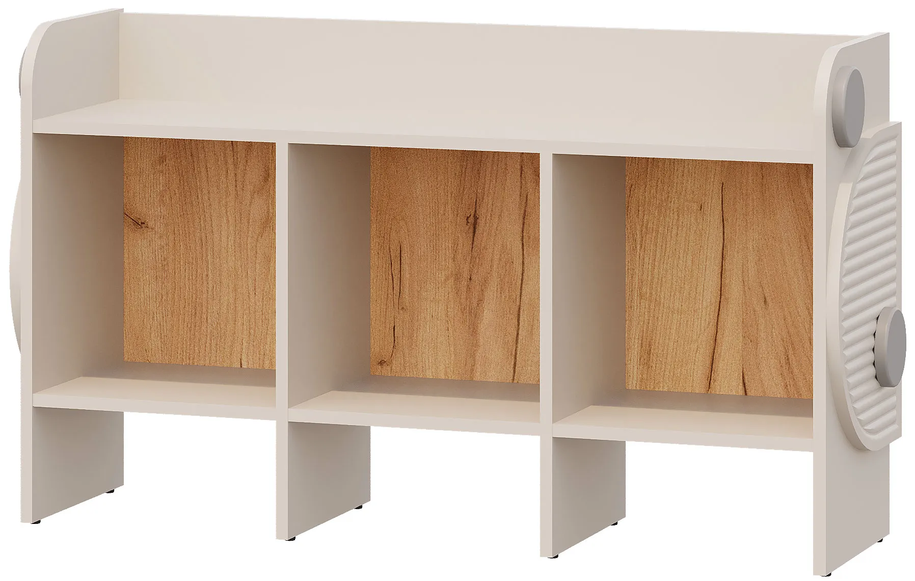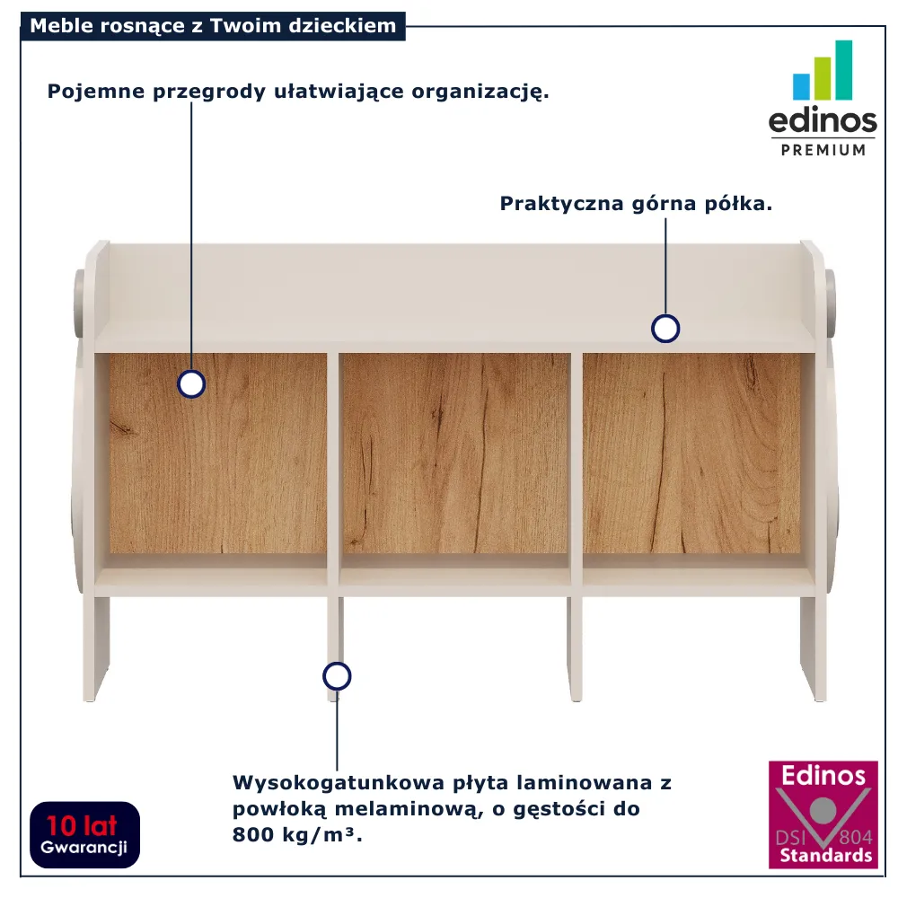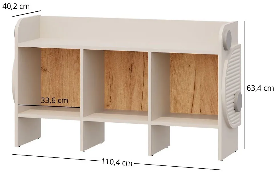 • Trzy szerokie, otwarte wnęki idealne na książki, pojemniki, zabawki i akcesoria