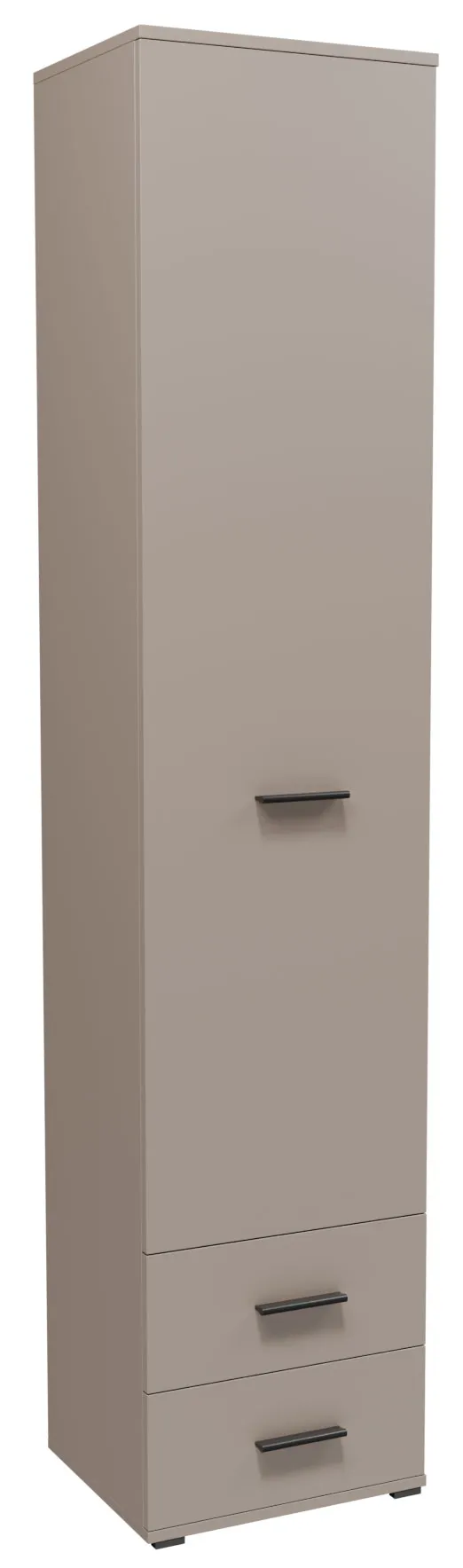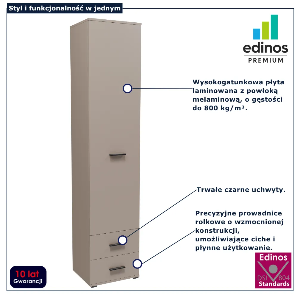 Szafa jednodrzwiowa z 2 szufladami Asendri 15X marki Edinos Premium to kompaktowe, a jednocześnie bardzo funkcjonalne rozwiązanie do przechowywania. Smukła konstrukcja sprawia, że mebel doskonale sprawdzi się nawet w węższych pomieszczeniach, oferując zaskakująco dużą przestrzeń użytkową. Wnętrze wyposażone w praktyczne półki umożliwia wygodne uporządkowanie odzieży, dokumentów czy domowych akcesoriów, a dolne szuflady zapewniają dodatkowe miejsce na drobiazgi. To idealny wybór dla osób, które chcą zachować porządek bez rezygnacji z estetyki.