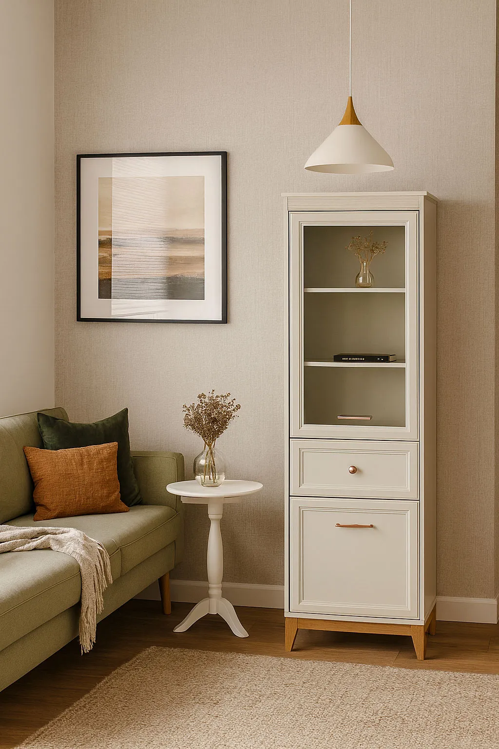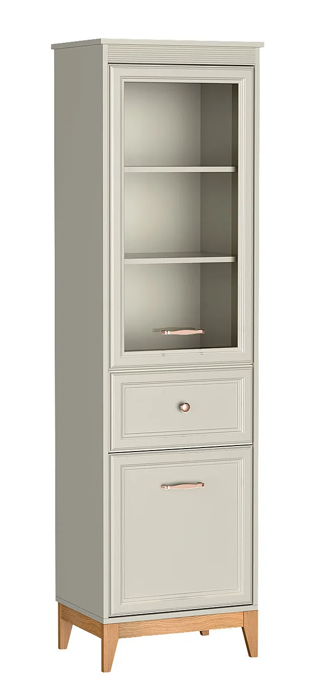 Słupek z witryną Lunvior 6X to mebel, który łączy w sobie lekkość klasycznego designu i nowoczesną funkcjonalność. Jego smukła forma sprawia, że idealnie wpisuje się zarówno w przestronne, jak i mniejsze wnętrza, dodając im wrażenia ładu i harmonii. Subtelny kaszmirowy odcień korpusu, ozdobne ryflowania pod blatem oraz delikatne uchwyty w kolorze różowego złota tworzą wytworną kompozycję o ponadczasowym charakterze. W górnej części witryny znajdują się przeszklone półki, na których można wyeksponować porcelanę, książki, szklane dekoracje lub pamiątki rodzinne. Niżej umieszczono pojemną szufladę na drobiazgi, a za dolnymi drzwiczkami kryje się funkcjonalna przestrzeń do przechowywania większych przedmiotów. To idealne rozwiązanie do salonu, jadalni lub gabinetu, gdzie liczy się zarówno estetyka, jak i porządek.