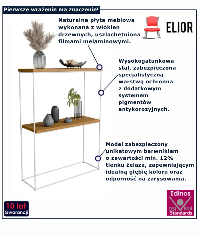 • Produkt posiada certyfikat jakości "Edinos Standards DSI 804", który potwierdza najwyższą jakość wykonania mebla oraz pełny stopień zgodności poszczególnych jednostek wytworzonego wyrobu z przyjętym wzorcem.
