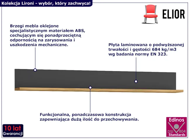 Zapomnij o kompromisach w aranżacji swojego salonu. Kolekcja mebli do salonu Lironi marki Elior, to połączenie nowoczesnego designu, funkcjonalności i doskonałej jakości wykonania. Twórz przestrzeń, która odzwierciedla Twój unikalny styl życia i czerp radość z pięknie urządzonego salonu. Wybierz wiszącą półkę Igiz 7X i spraw, by Twój salon stał się sercem Twojego domu, przyciągającym uwagę i zapraszającym do relaksu. Zdecyduj się już dzisiaj na zakup w rewelacyjnej cenie 138 zł.