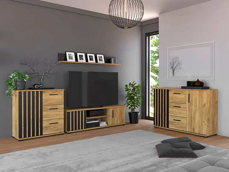 • Eleganckie Lamele: Charakterystyczne czarne lamele nadają meblom unikalny, elegancki wygląd, który przyciąga uwagę.