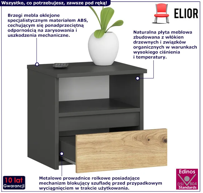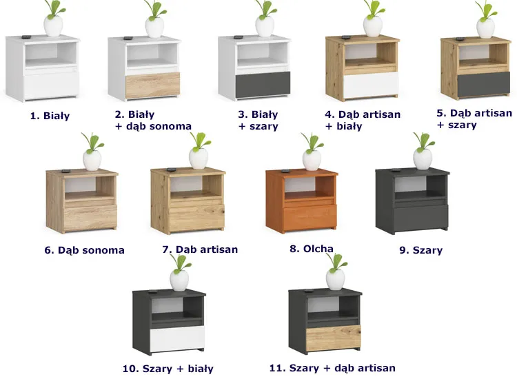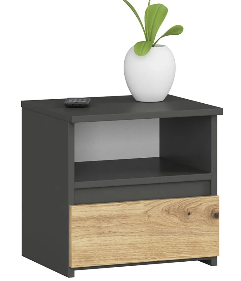 • Kolor: szary + dąb artisan. W naszej ofercie posiadamy także inne szafki nocne 40 cm.