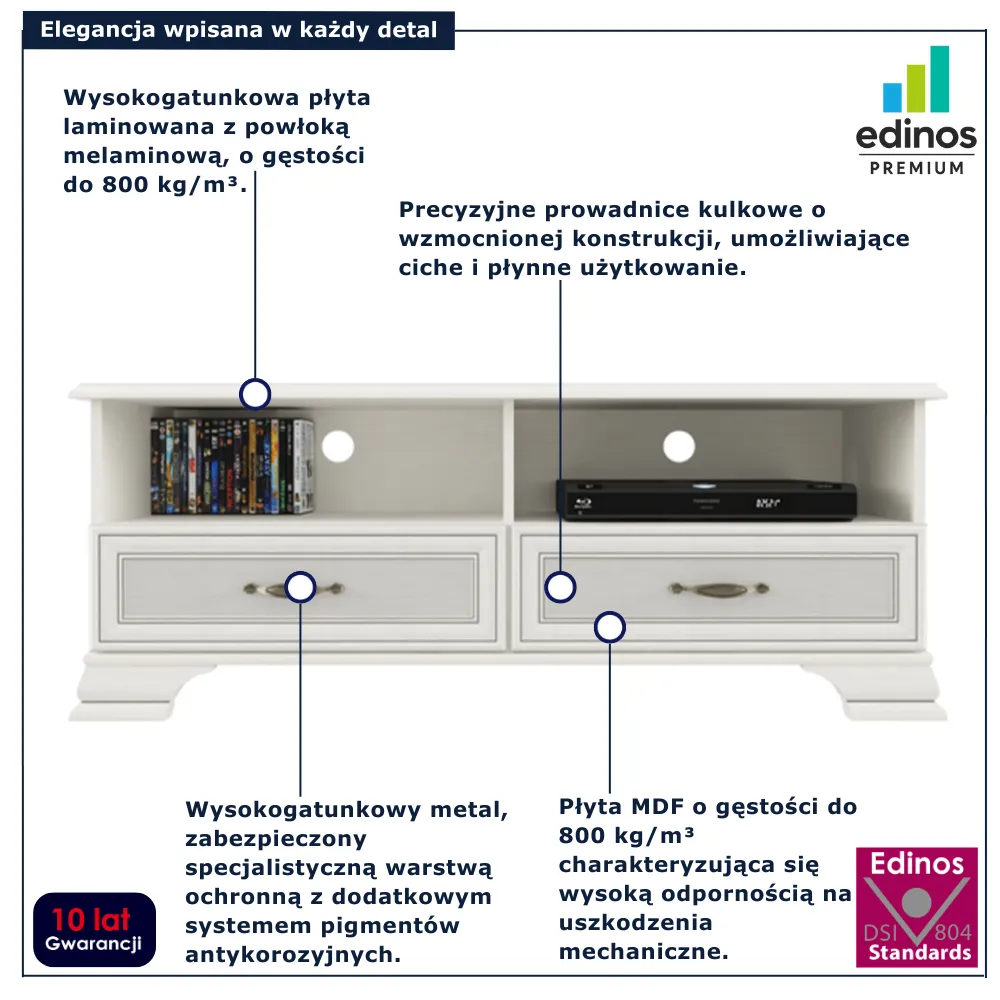 • Produkt posiada certyfikat jakości "Edinos Standards DSI 804", który potwierdza najwyższą jakość wykonania mebla oraz pełny stopień zgodności poszczególnych jednostek wytworzonego wyrobu z przyjętym wzorcem.