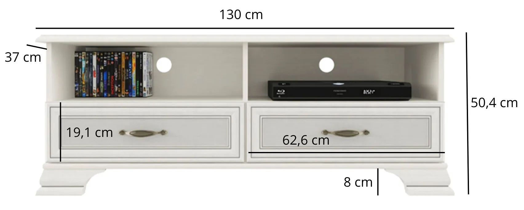 • Szerokość: 130 cm, wysokość: 50,4 cm, głębokość 37 cm.