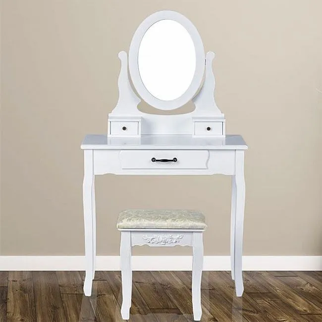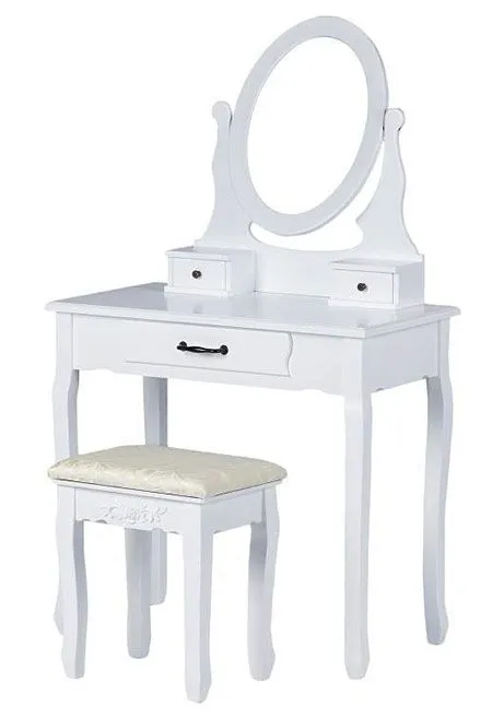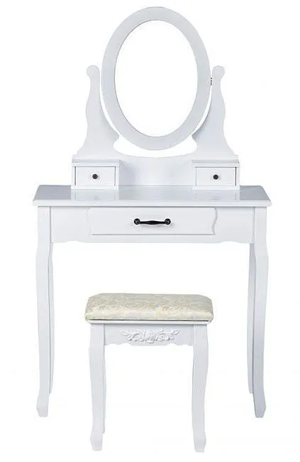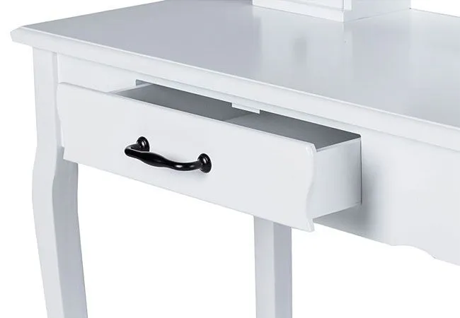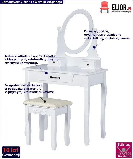 - Wspaniały dworski wygląd: biały kolor, kształtne nogi mebla i ozdobne lustro z oryginalnie wygiętą ramą + eleganckie uchwyty malowane proszkowo - zobacz też inne modele toaletek z naszej oferty, na pewno znajdziesz coś dla siebie