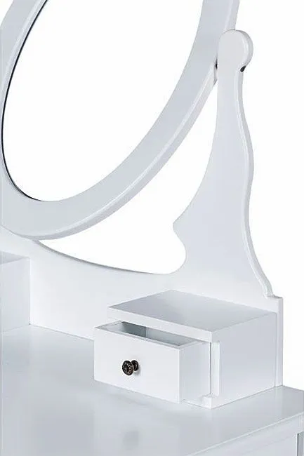 W naszej dbałości o najwyższą jakość oferowanych mebli, wykonaliśmy toaletkę z eleganckiej, lakierowanej na lśniącą biel płyty MDF uszlachetnionej cienkimi filmami melaminowymi. Taka płyta przewyższa wiele materiałów, w tym surowe drewno w kwestii niskiej porowatości a wysokiej spójności, dzięki czemu nie wchłania zanieczyszczeń i jest łatwa do utrzymania w czystości. Charakteryzuje się także ogólną wysoką odpornością na uszkodzenia mechaniczne takie jak np. zarysowania. Śliczny taboret będący częścią zestawu jest powleczony materiałem polimerowym o wyjątkowej gładkości i subtelnym połysku, który także wykazuje się niższą niż przeciętnie chłonnością plam i łatwiej się czyści – czy to nie idealne cechy do mebli, przy których może znaleźć się wiele brudzących substancji pod postacią kosmetyków? Teraz nie musisz się o to martwić! Toaletka Margino 4X będzie spełnieniem dziewczęcego marzenia o własnym meblu, przy którym poczujesz się jak królowa!