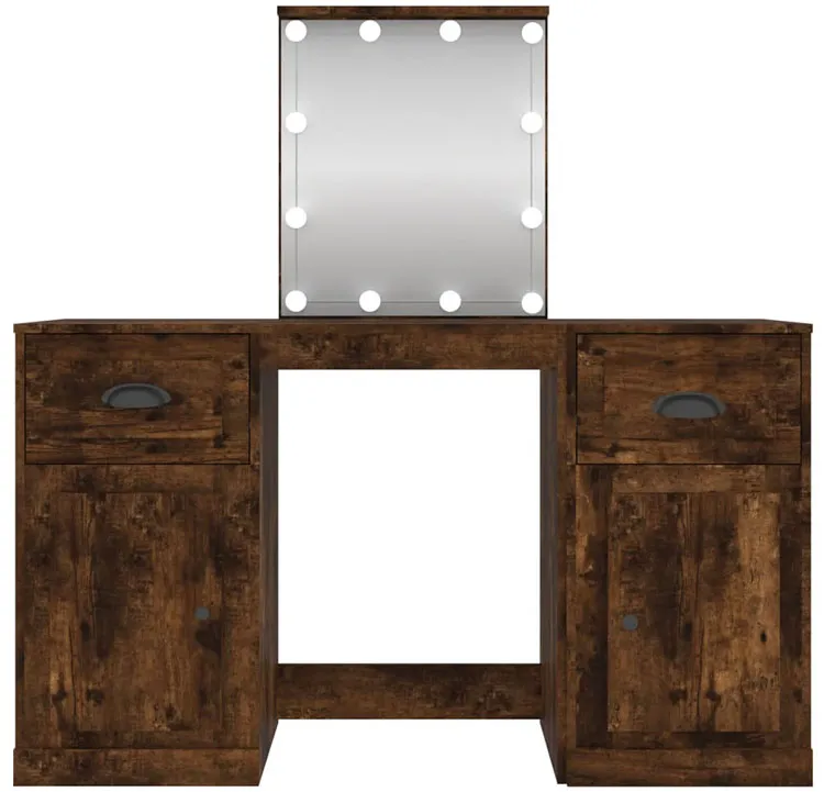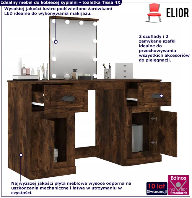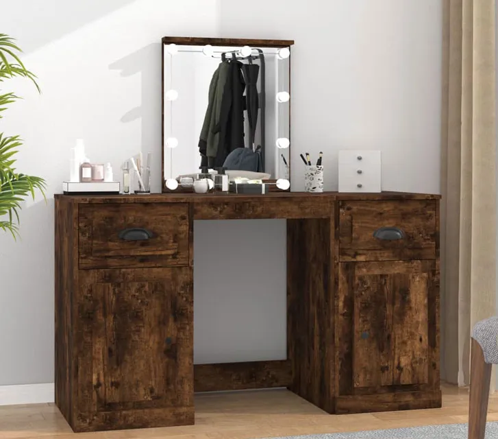 • Kolor: przydymiony dąb. W naszej ofercie posiadamy także inne toaletki z lampkami.