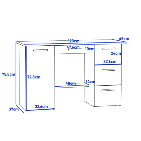 • długi blat o szerokości 120 cm zapewnia komfortową przestrzeń do pracy na laptopie, dokumentach czy innych potrzebnych materiałach.
