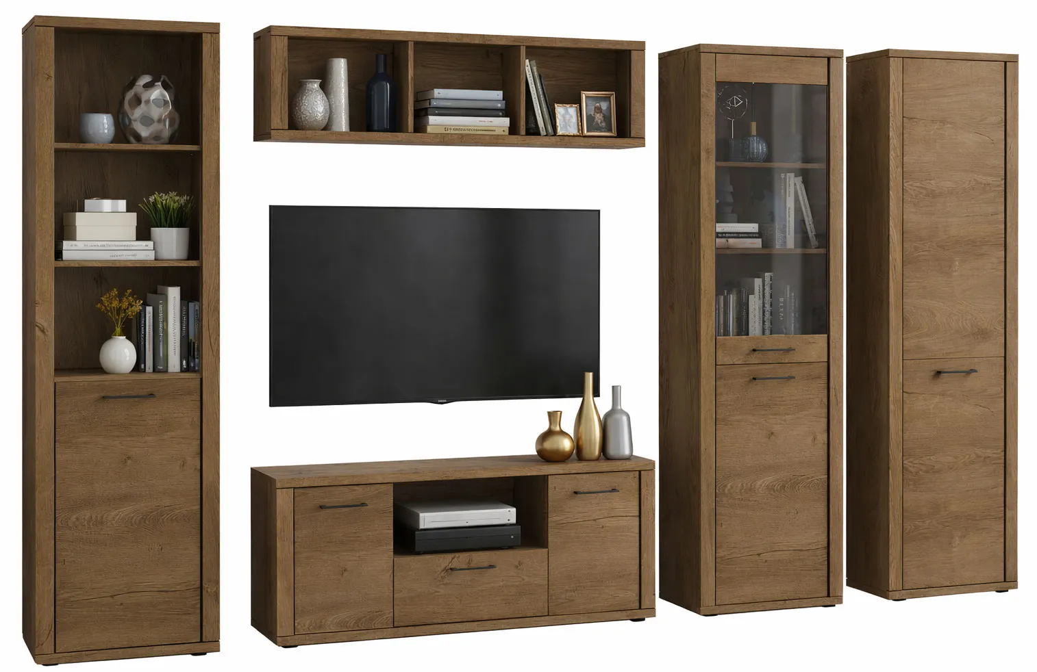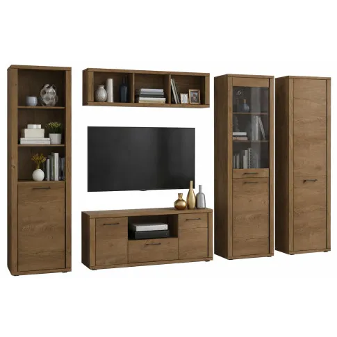• Praktyczne rozwiązania: szafka RTV z szufladą, regał wiszący nad telewizorem, witryna oraz regał zamykany i otwarty zapewniają różnorodne możliwości przechowywania.