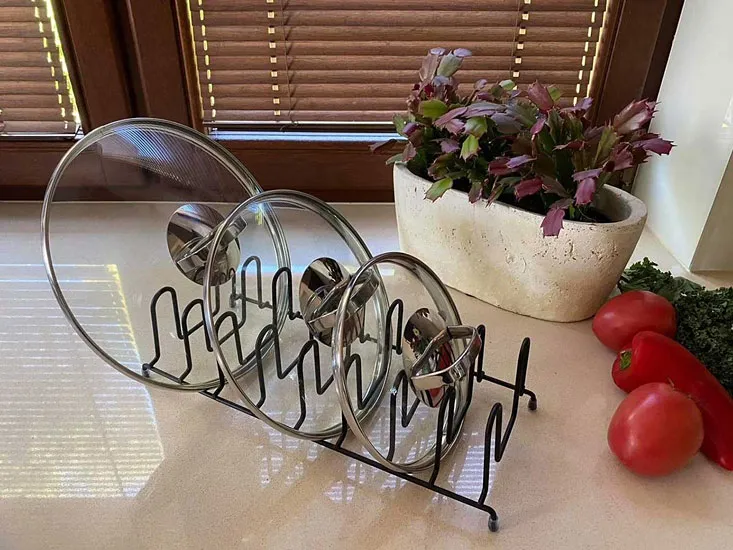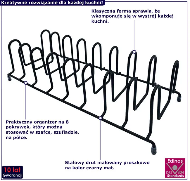 Stojak świetnie się sprawdza w kuchni i ułatwia przechowywanie pokrywek bez bałaganu. Na plus też solidna metalowa konstrukcja, estetyczny wygląd.