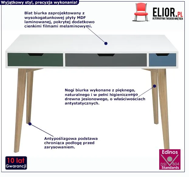 - Modna kolorystyka: biały, naturalne drewno, zielony, szary, niebieski. Kliknij w link i sprawdź także inne biurka skandynawskie w sklepie Edinos.pl. Stwórz swój praktyczny zestaw mebli.