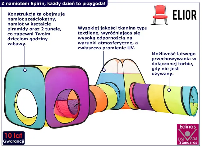 • Kolor: wielobarwny. Kliknij w link i sprawdź także inne namioty dla dzieci w sklepie Edinos.pl. Stwórz swóją praktyczną przestrzeń.