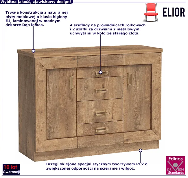 Stylowa komoda Lorines 6X to wyjątkowa propozycja marki Elior skierowana do osób poszukujących trwałych i praktycznych mebli w niesztampowym wydaniu. Mebel charakteryzuje się klasyczną formą w angielskim stylu oraz unikatową kolorystyką w modnym wybarwieniu Dąb lefkas. Subtelne akcenty dekoracyjne w postaci szerokich listew MDF i metalowych uchwytów w odcieniu starego złota rewelacyjnie podkreślają wytworną elegancję mebla. Lorines 6X doskonale uzupełni aranżację salonu, pokoju dziennego lub jadalni zapewniając sporo miejsca do przechowywania. Komoda świetnie odnajdzie się w sypialni, pokoju dzięcięcym i młodzieżowym jako wygodna bieliźniarka i stylowa szafka nocna jednocześnie. Przestronne wnętrze z 4 pojemnymi szufladami i 2 zamykanymi szafkami wspaniale zorganizuje domowe biuro, a w przedpokoju zapewni porządek wśród kluczy, szalików i czapek lub przyborów do czyszczenia butów. Wyrafinowany design zestawiony z ciekawą kolorystyką i szlachetnymi stylistycznie detalami to strzał w 10 w klimatycznej aranżacji wnętrza!