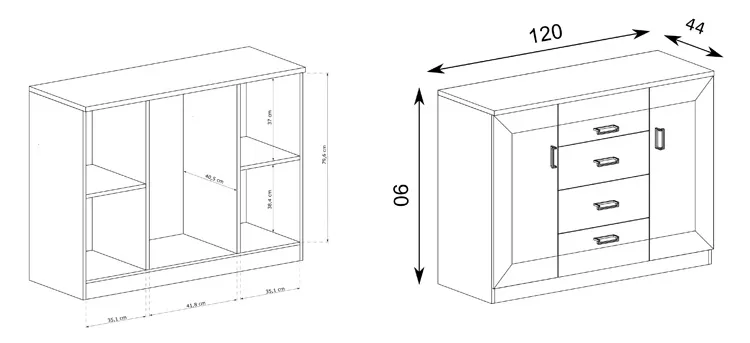 - Wymiary całkowite: wysokość: 90 cm, szerokość: 120 cm, głębokość: 44 cm.
