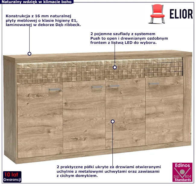 Komodę Leticia 11X zrobiliśmy z najwyższej jakości 16 mm laminowanej płyty meblowej o klasie higieny E1. Płyta charakteryzuje się ciekawą strukturą, która idealnie odwzorowuje naturalną fakturę i usłojenie drewna. Brzegi mebla zostały precyzyjnie oklejone specjalistycznym tworzywem PCV o zwiększonej odporności na ścieranie i wilgoć. Dekoracyjny akcent w postaci naturalnej sosnowej listwy rzeźbionej w przestrzenny wzór kratki fenomenalnie podnosi walory dekoracyjne mebla. A dodatkowa opcja oświetlenia LED subtelnie wyeksponuje oryginalny dekor. Przestronne wnętrze mebla zostało zorganizowanie w wyjątkowo przemyślany sposób. Dwie, głębokie szuflady wyposażone w mechanizm "push to open" otwierają się po lekkim naciśnięciu frontu w odpowiednim miejscu, gwarantując natychmiastowy dostęp do zawartości. W dolnej części komody znajdują się 4 praktyczne szafki, każda z półką dzielącą przestrzeń na pół. Uchylne drzwi szafek wyposażone w system cichego domyku Blumer 4X Plus, otwierają i zamykają się lekko i bezszelestnie. Tak wykonana komoda Leticia 11X marki Elior świetnie sprawdzi się w salonie, sypialni, przedpokoju lub gabinecie zapewniając nie tylko sporo miejsca do przechowywania, ale także fenomenalnie dekorując wnętrze.