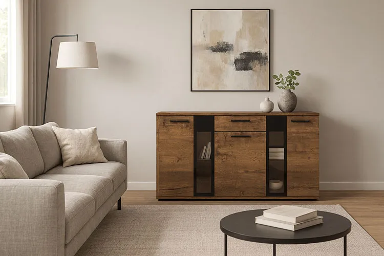 Dotyczy: Komoda ze szkłem w kolorze dąb artisan + biały - Melorix