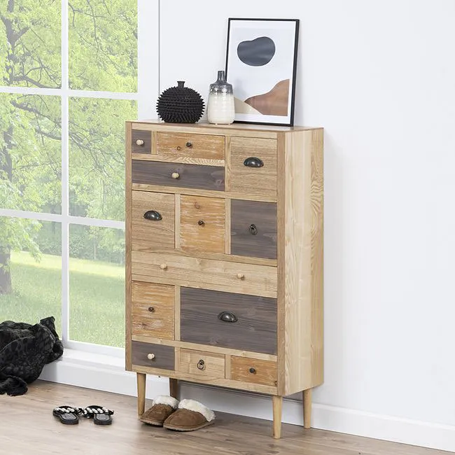 Cała kolekcja Timbo została stworzona poprzez inspirację przyrodą i naturą. Każdy element mebla charakteryzuje się barwami pochodzącymi z środowiska roślinnego - a dokładniej jest odzwierciedleniem naturalnego drewna jesionowego. Specyfiką jesionu jest jego rozmaite ubarwienie, które zostało zaprezentowane dzięki szufladom, które nieco różnią się od siebie odcieniem. Takie zalety komody pozwolą Ci na dopasowanie jej do wnętrz zaaranżowanych w stylu skandynawskim, nowoczesnym i klasycznym. Meble są bardzo ważne we wnętrzu każdego domu. Pozwalają stworzyć przyjemną atmosferę wypełniając pustą przestrzeń, a także sprawiają, że organizacja domowej powierzchni staje się o wiele łatwiejsza. Liczna ilość szuflad o różnych rozmiarach to możliwość znalezienia odpowiedniego miejsca na ubrania, dokumenty lub drobiazgi w każdym rozmiarze. Dzięki tak ustrukturalizowanemu przechowywaniu swoich rzeczy zawsze znajdziesz to czego szukasz! Ustawiając mebel w sypialni, salonie czy przedpokoju wprowadzisz nie tylko porządek i ład, ale również stworzysz praktyczną dekorację pomieszczenia.