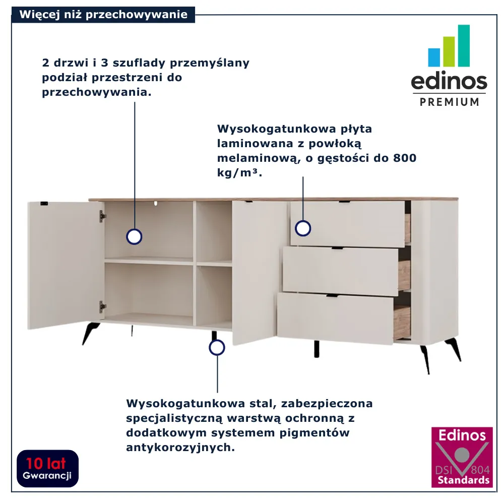 Komdoa Sodo 4X marki Edinos Premium oferuje przemyślany układ dwóch drzwi i trzech pojemnych szuflad, co daje szerokie możliwości organizacji przestrzeni. Subtelnie zaoblone krawędzie i nowoczesna linia sprawiają, że ta komoda świetnie wpisuje się w różnorodne style wnętrz, od skandynawskich po klasyczne. To mebel, który łączy funkcjonalność z eleganckim, harmonijnym wyglądem.