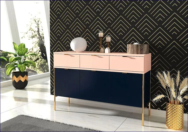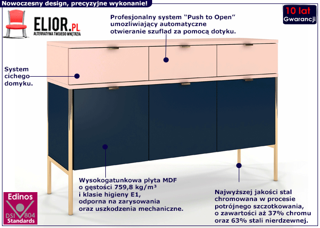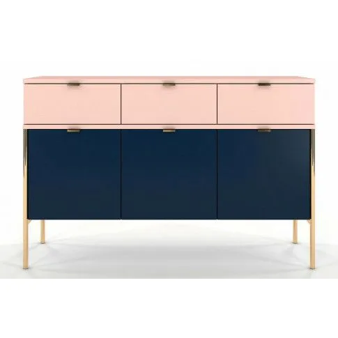 Komoda - niezbędny i jakże doskonały mebel znajdujący się niemal w każdym mieszkaniu. To dzięki niej wszystko znajduje się na swoim miejscu, a we wnętrzu panuje ład i harmonia. Czy wiesz, że słowo "commode" oznacza po francusku wygodny? Doskonale wpisuje się w charakterystykę tego mebla, nieprawdaż? Marly 3X to komoda zapewniająca maksymalny komfort w designerskim stylu. Pozornie prosty, jednak wyjątkowo oryginalny mebel wprowadzający do wnętrza nadzwyczajnie elegancki charakter. Korpus w temperamentnym odcieniu granatu z dodatkiem różu w doskonały sposób został połączony ze złotymi nóżkami zachodzącymi na mebel i pnącymi się pod same szuflady. Prostokątna konstrukcja komody dzieli się na dwie przestrzenie do przechowywania - trzy zamknięte szafki w odcieniu głębokiego granatu oraz trzy pojemne szuflady w kolorze subtelnego różu. Delikatna złota podstawa dodająca całości nadzwyczajnej lekkości i elegancji ułatwia utrzymanie czystości pod meblem. Szuflady mimo zastosowanych uchwytów wzbogacone zostały w nowoczesny system „Push to Open” dzięki któremu wystarczy lekko nacisnąć na front, aby otworzyły się automatycznie. Dodatkowo zastosowano system cichego domyku, który sprawia, że domykają się bezgłośnie - właściwie same. Zadbaj o perfekcyjny porządek w Twoim wnętrzu jednocześnie tworząc designerską aranżację zachwycającą swym urokiem!