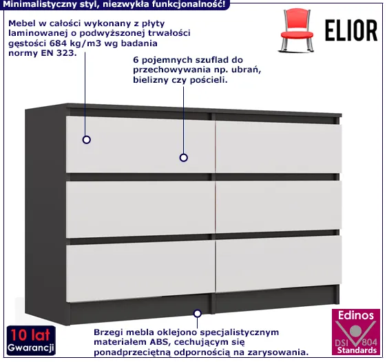 Przedstawiamy Ci zachwycającą komodę Berta marki Edinos Premium. Produkty Edinos Premium charakteryzują się wyrazistym designem i dbałością o każdy szczegół mebla, a wdzięk i nowoczesność, jak również mocna i stabilna konstrukcja, to cechy najnowszego mebla Nala. Komoda wykonana została z laminowanej płyty meblowej o klasie higieny E1, uszlachetnionej cienkimi filmami melaminowymi. Posiada także specjalne włókna ułożone różnokierunkowo o strukturze sinusoidalnej, co zapewnia nadanie jej cech jakościowych oraz wytrzymałościowych. Dla zwiększenia wytrzymałości i trwałości mebla, obrzeża komody wykończono odpornym na uszkodzenia mechaniczne tworzywem PCV. Szuflady na prowadnicach rolkowych z blokadą są gwarancją wygodnego i przede wszystkim bezpiecznego użytkowania. Bezuchwytowe fronty podkreślają nowoczesny i modernistyczny styl mebla. Sześć pojemnych szuflad jest wyjątkowo praktycznych i zapewnia komfortowe przechowywanie np. odzieży czy dodatków. Stonowana kolorystyka i prosta forma sprawiają, że komoda Berta doskonale sprawdza się we wnętrzach urządzonych w stylu skandynawskim, jak też minimalistycznym czy nowoczesnym. Świetnie nadaje się także do wnętrz dziecięcych czy młodzieżowych. Stwórz w swoim domu niepowtarzalny i ciepły klimat z szafką marki Edinos Premium!