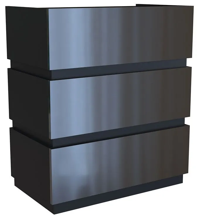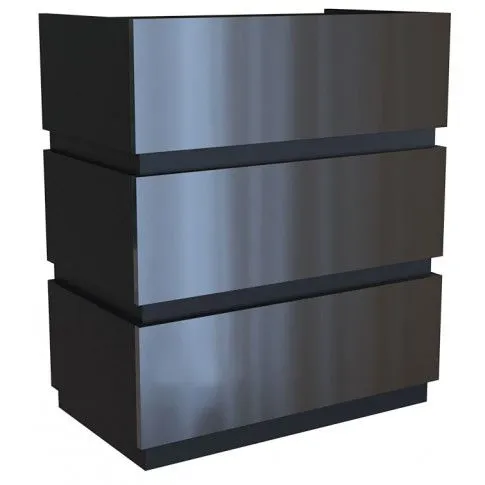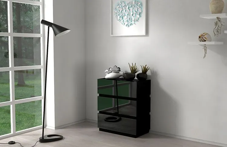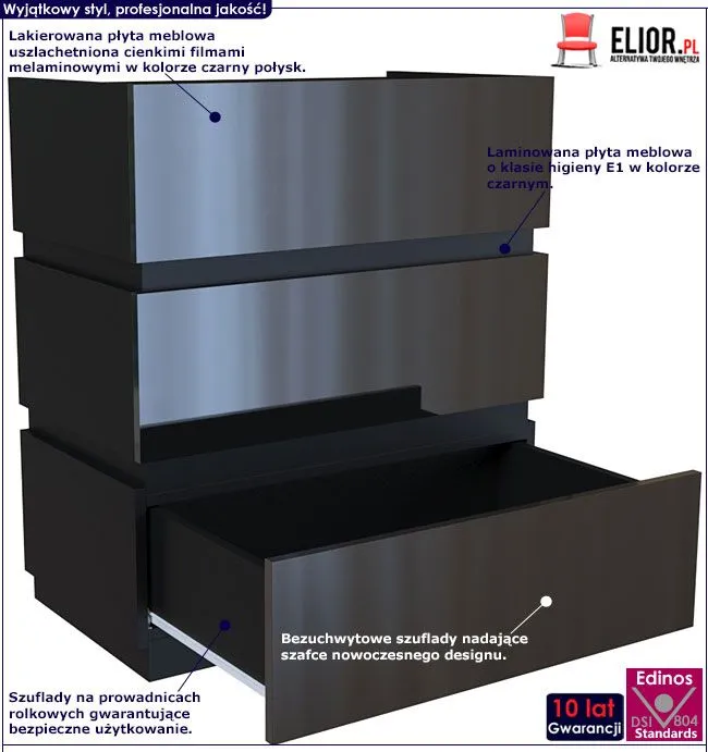 Użyta do produkcji frontów szafki lakierowana płyta meblowa w kolorze czarny połysk została uszlachetniona cienkimi filmami melaminowymi. Posiada także specjalne włókna ułożone różnokierunkowo o strukturze sinusoidalnej, co zapewnia nadanie jej cech jakościowych oraz wytrzymałościowych. Zastosowana technologia sprzyja utrzymywaniu mebla w czystości. Korpus mebla w kolorze czarnym wyprodukowano z płyty laminowanej o podwyższonej trwałości i gęstości. Dla zwiększenia wytrzymałości i trwałości mebla, obrzeża komody wykończono odpornym na uszkodzenia mechaniczne tworzywem PCV. Szuflady na prowadnicach rolkowych są gwarancją wygodnego i przede wszystkim bezpiecznego użytkowania. Bezuchwytowe fronty podkreślają nowoczesny i modernistyczny styl mebla. Trzy pojemne szuflady są wyjątkowo praktyczne i zapewniają komfortowe przechowywanie nie tylko ubrań czy dodatków. Stonowana kolorystyka i prosta, współczesna forma sprawiają, że szafka Sedia doskonale sprawdza się we wnętrzach urządzonych zarówno w stylu skandynawskim, jak też minimalistycznym czy nowoczesnym. Świetnie nadaje się także do wnętrz dziecięcych czy młodzieżowych. Stwórz w swoim domu niepowtarzalny i ciepły klimat z komodą marki Elior!