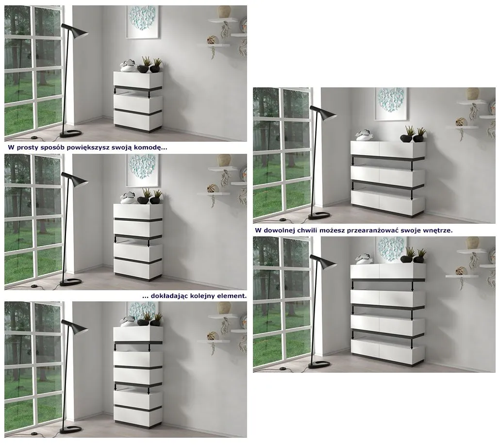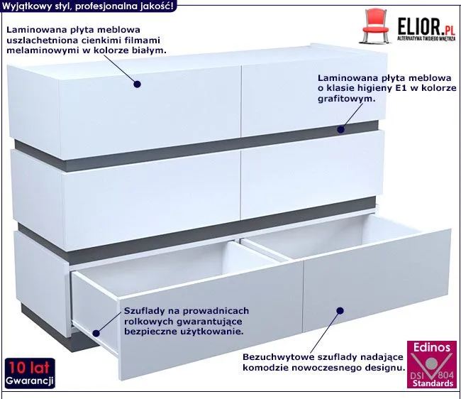 - Kolor: Fronty mebla w kolorze białym, listy środkowe - grafit. Kliknij w link i sprawdź także inne białe komody w sklepie Edinos.pl. Stwórz swój praktyczny zestaw mebli.