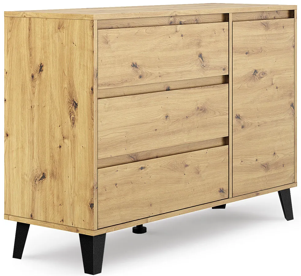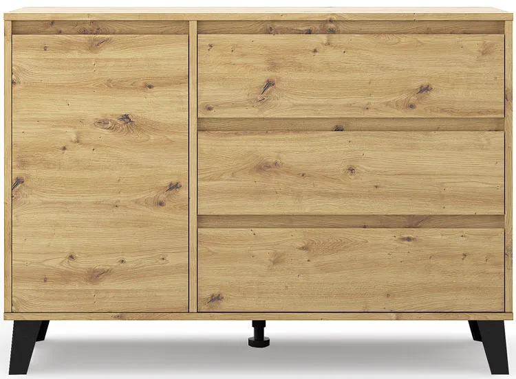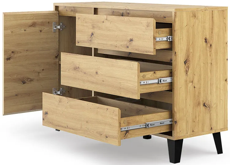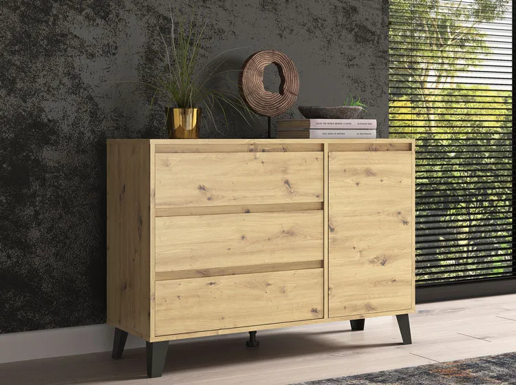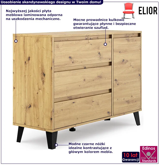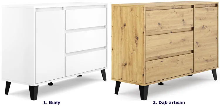 • Elastyczna konstrukcja: unikalny design pozwala na konfigurację komody według Twoich potrzeb. Ty decydujesz, po której stronie będą szuflady, a po której drzwi z półką.