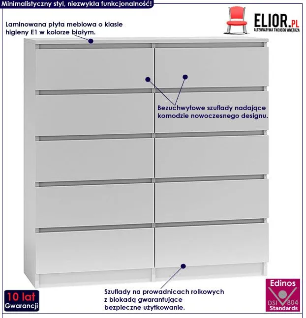 Przedstawiamy Ci zachwycającą komodę Noel 2X z kolekcji Martis marki Elior. Produkty Elior charakteryzują się wyrazistym designem i dbałością o każdy szczegół mebla, a wdzięk i nowoczesność, jak również mocna i stabilna konstrukcja, to cechy najnowszego mebla Rossa. Komoda wykonana została z laminowanej płyty meblowej o klasie higieny E1, uszlachetnionej cienkimi filmami melaminowymi. Posiada także specjalne włókna ułożone różnokierunkowo o strukturze sinusoidalnej, co zapewnia nadanie jej cech jakościowych oraz wytrzymałościowych. Dla zwiększenia wytrzymałości i trwałości mebla, obrzeża komody wykończono odpornym na uszkodzenia mechaniczne tworzywem PCV. Szuflady na prowadnicach rolkowych z blokadą są gwarancją wygodnego i przede wszystkim bezpiecznego użytkowania. Bezuchwytowe fronty podkreślają nowoczesny i modernistyczny styl mebla. Dziesięć pojemnych szuflad jest wyjątkowo praktycznych i zapewnia komfortowe przechowywanie np. odzieży czy dodatków. Stonowana kolorystyka i prosta forma sprawiają, że komoda Rossa doskonale sprawdza się we wnętrzach urządzonych w stylu skandynawskim, jak też minimalistycznym czy nowoczesnym. Świetnie nadaje się także do wnętrz dziecięcych czy młodzieżowych. Stwórz w swoim domu niepowtarzalny i ciepły klimat z szafką marki Elior!