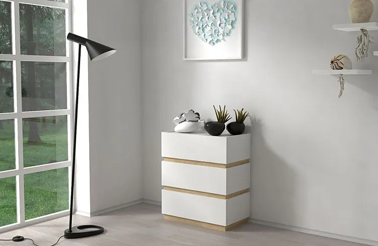 Komoda wykonana została z laminowanej płyty meblowej uszlachetnionej cienkimi filmami melaminowymi. Posiada także specjalne włókna ułożone różnokierunkowo o strukturze sinusoidalnej, co zapewnia nadanie jej cech jakościowych oraz wytrzymałościowych. Dla zwiększenia wytrzymałości i trwałości mebla, obrzeża komody wykończono odpornym na uszkodzenia mechaniczne tworzywem PCV. Szuflady na prowadnicach rolkowych są gwarancją wygodnego i przede wszystkim bezpiecznego użytkowania. Bezuchwytowe fronty podkreślają nowoczesny i modernistyczny styl mebla. Trzy pojemne szuflady są wyjątkowo praktyczne i zapewniają komfortowe przechowywanie nie tylko ubrań czy dodatków. Stonowana kolorystyka i prosta, współczesna forma sprawiają, że szafka Sedia doskonale sprawdza się we wnętrzach urządzonych zarówno w stylu skandynawskim, jak też minimalistycznym czy nowoczesnym. Świetnie nadaje się także do wnętrz dziecięcych czy młodzieżowych. Stwórz w swoim domu niepowtarzalny i ciepły klimat z komodą marki Elior!