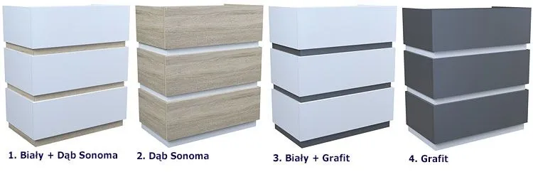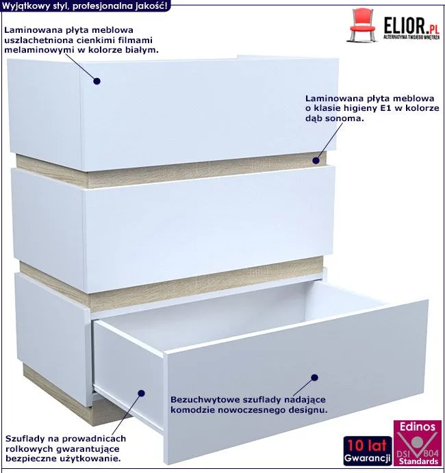 - Kolor: Fronty mebla w kolorze białym, listy środkowe - dąb sonoma. Kliknij w link i sprawdź także inne białe komody w sklepie Edinos.pl. Stwórz swój praktyczny zestaw mebli.