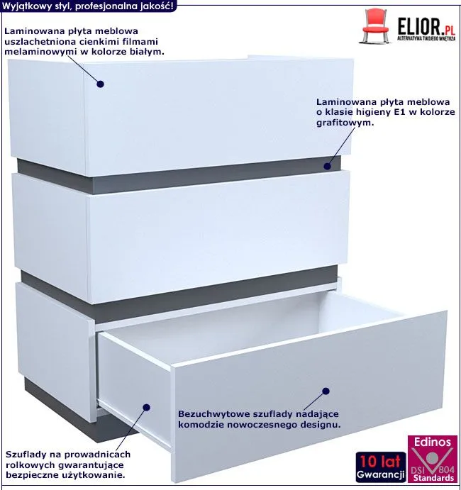 - Kolor: Fronty mebla w kolorze białym, listy środkowe - grafit. Kliknij w link i sprawdź także inne białe komody w sklepie Edinos.pl. Stwórz swój praktyczny zestaw mebli.