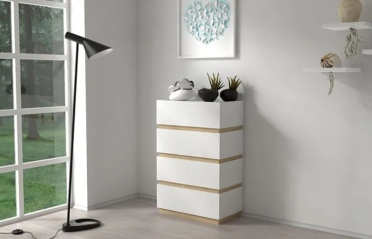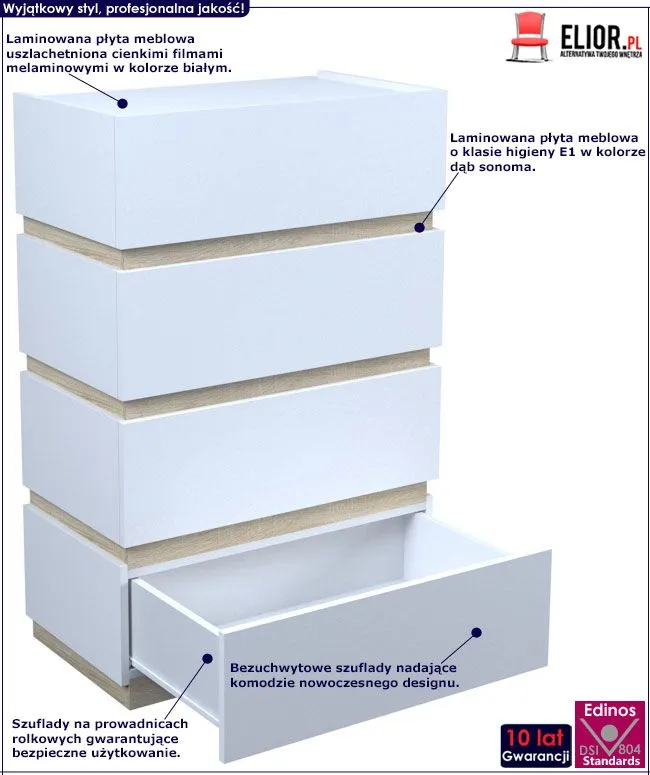 Komoda wykonana została z laminowanej płyty meblowej uszlachetnionej cienkimi filmami melaminowymi. Posiada także specjalne włókna ułożone różnokierunkowo o strukturze sinusoidalnej, co zapewnia nadanie jej cech jakościowych oraz wytrzymałościowych. Dla zwiększenia wytrzymałości i trwałości mebla, obrzeża komody wykończono odpornym na uszkodzenia mechaniczne tworzywem PCV. Szuflady na prowadnicach rolkowych są gwarancją wygodnego i przede wszystkim bezpiecznego użytkowania. Bezuchwytowe fronty podkreślają nowoczesny i modernistyczny styl mebla. Cztery pojemne szuflady są wyjątkowo praktyczne i zapewniają komfortowe przechowywanie nie tylko ubrań czy dodatków. Stonowana kolorystyka i prosta, współczesna forma sprawiają, że szafka Sedia doskonale sprawdza się we wnętrzach urządzonych zarówno w stylu skandynawskim, jak też minimalistycznym czy nowoczesnym. Świetnie nadaje się także do wnętrz dziecięcych czy młodzieżowych. Stwórz w swoim domu niepowtarzalny i ciepły klimat z komodą marki Elior!