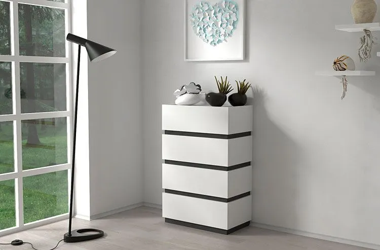 Komoda wykonana została z laminowanej płyty meblowej uszlachetnionej cienkimi filmami melaminowymi. Posiada także specjalne włókna ułożone różnokierunkowo o strukturze sinusoidalnej, co zapewnia nadanie jej cech jakościowych oraz wytrzymałościowych. Dla zwiększenia wytrzymałości i trwałości mebla, obrzeża komody wykończono odpornym na uszkodzenia mechaniczne tworzywem PCV. Szuflady na prowadnicach rolkowych są gwarancją wygodnego i przede wszystkim bezpiecznego użytkowania. Bezuchwytowe fronty podkreślają nowoczesny i modernistyczny styl mebla. Cztery pojemne szuflady są wyjątkowo praktyczne i zapewniają komfortowe przechowywanie nie tylko ubrań czy dodatków. Stonowana kolorystyka i prosta, współczesna forma sprawiają, że szafka Sedia doskonale sprawdza się we wnętrzach urządzonych zarówno w stylu skandynawskim, jak też minimalistycznym czy nowoczesnym. Świetnie nadaje się także do wnętrz dziecięcych czy młodzieżowych. Stwórz w swoim domu niepowtarzalny i ciepły klimat z komodą marki Elior!