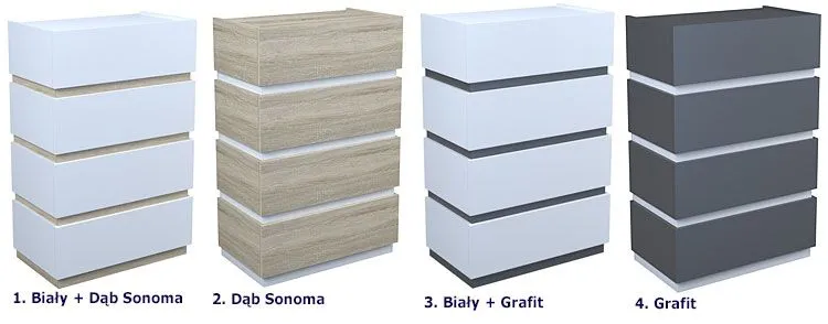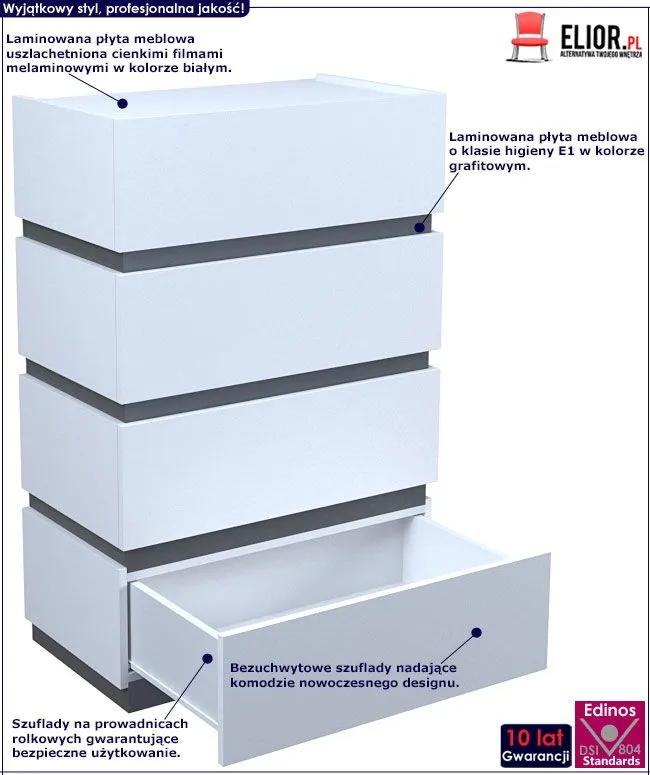 - Kolor: Fronty mebla w kolorze białym, listy środkowe - grafit. Kliknij w link i sprawdź także inne białe komody w sklepie Edinos.pl. Stwórz swój praktyczny zestaw mebli.