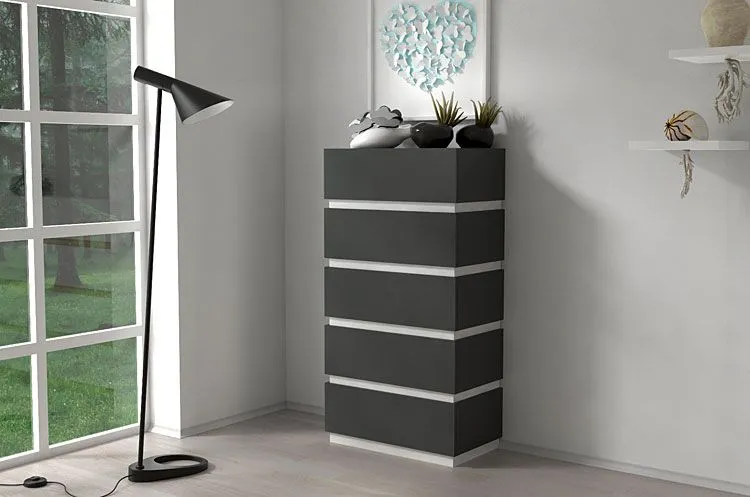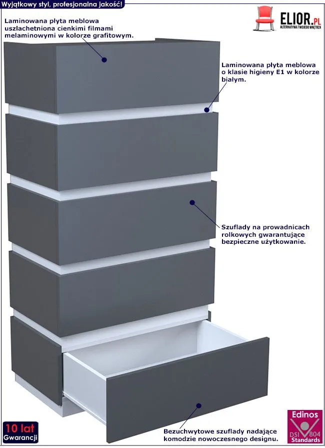 - Kolor: Fronty mebla w kolorze grafitowym, listy środkowe - białe. Kliknij w link i sprawdź także inne komody grafitowe w sklepie Edinos.pl. Stwórz swój praktyczny zestaw mebli.