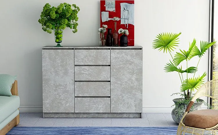 Minimalistyczna komoda Intia wyróżnia się nie tylko wysoką funkcjonalnością i atrakcyjnym designem, wykonano ją także z dokładnie wyselekcjonowanych materiałów. Użyta do jej produkcji laminowana płyta meblowa w kolorze beton została uszlachetniona cienkimi filmami melaminowymi. Posiada także specjalne włókna ułożone różnokierunkowo o strukturze sinusoidalnej, co zapewnia nadanie jej cech jakościowych oraz wytrzymałościowych. Zastosowana technologia sprzyja utrzymywaniu mebla w czystości. Dla zwiększenia wytrzymałości i trwałości komody, obrzeża szafki wykończono odpornym na uszkodzenia mechaniczne tworzywem PCV.