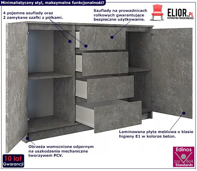 - Kolor: Beton. Kliknij w link i sprawdź także inne szare komody w sklepie Edinos.pl. Stwórz swój praktyczny zestaw mebli.