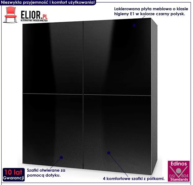 Designerska komoda Vitoria 2X wyróżnia się nie tylko swoją praktyczną formą i eleganckim kształtem, ale także zastosowaniem materiałów najlepszej jakości. To dlatego cieszy się powodzeniem wśród osób lubiących nowatorskie rozwiązania. Użyta do produkcji frontów szafki lakierowana płyta meblowa w kolorze czarny połysk została uszlachetniona cienkimi filmami melaminowymi. Posiada także specjalne włókna ułożone różnokierunkowo o strukturze sinusoidalnej, co zapewnia nadanie jej cech jakościowych oraz wytrzymałościowych. Zastosowana technologia sprzyja utrzymywaniu mebla w czystości. Korpus mebla w kolorze czarny mat wyprodukowano z płyty laminowanej o podwyższonej trwałości i gęstości. Drzwiczki z systemem push-click (komoda nie posiada uchwytów - otwierana jest za pomocą dotyku) gwarantują Ci niezwykle funkcjonalne korzystanie z mebla. Cztery przestronne szafki z półkami są niezwykle praktyczne i zapewniają komfortowe przechowywanie np. odzieży. Stonowana kolorystyka i prosta forma sprawiają, że komoda Vitoria 2X doskonale sprawdza się we wnętrzach urządzonych w stylu minimalistycznym czy nowoczesnym. Nadaj Twojemu wnętrzu wyrazistego designu, harmonizując go z tajemniczością wyrafinowanej czerni!