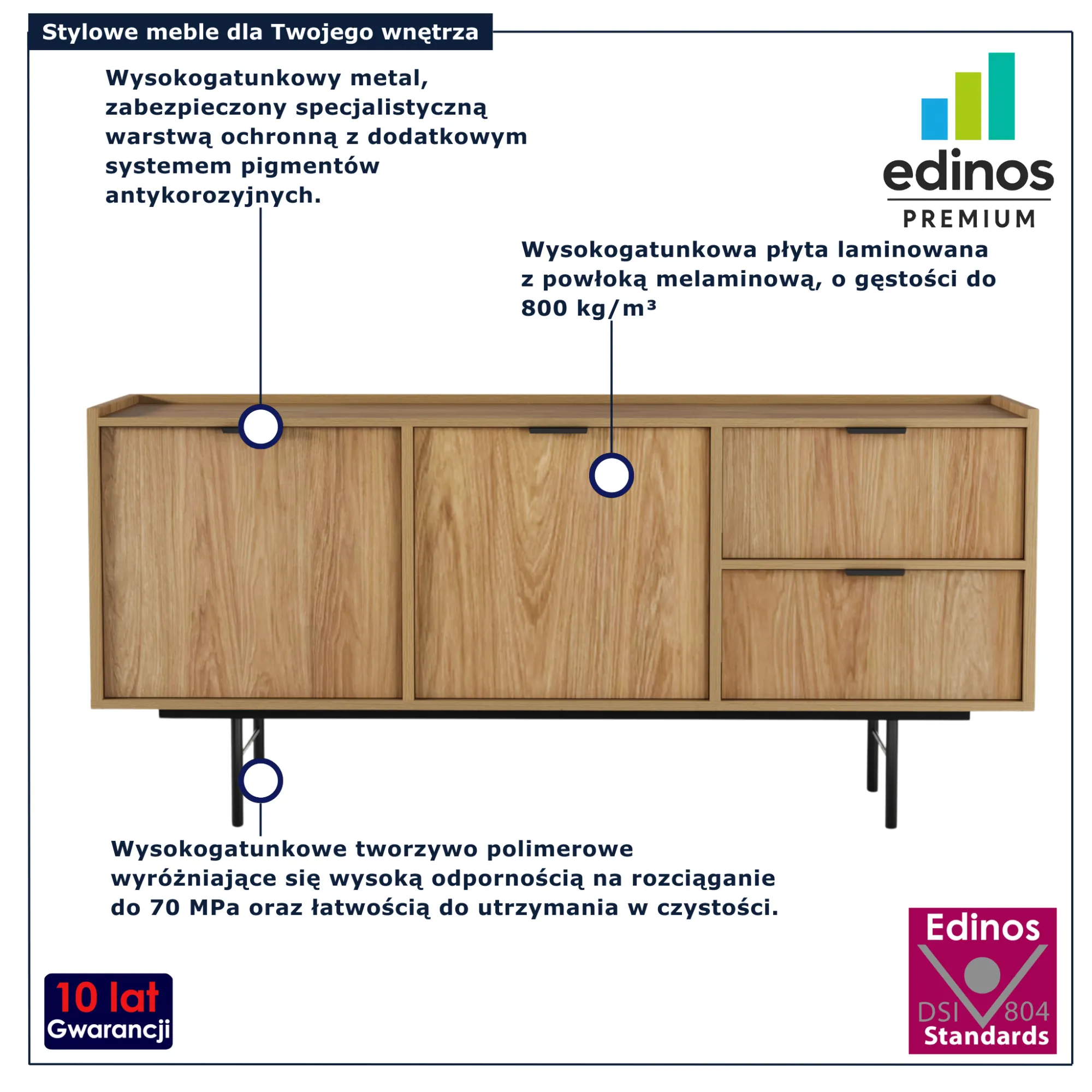 • Produkt posiada certyfikat jakości "Edinos Standards DSI 804", który potwierdza najwyższą jakość wykonania mebla oraz pełny stopień zgodności poszczególnych jednostek wytworzonego wyrobu z przyjętym wzorcem.