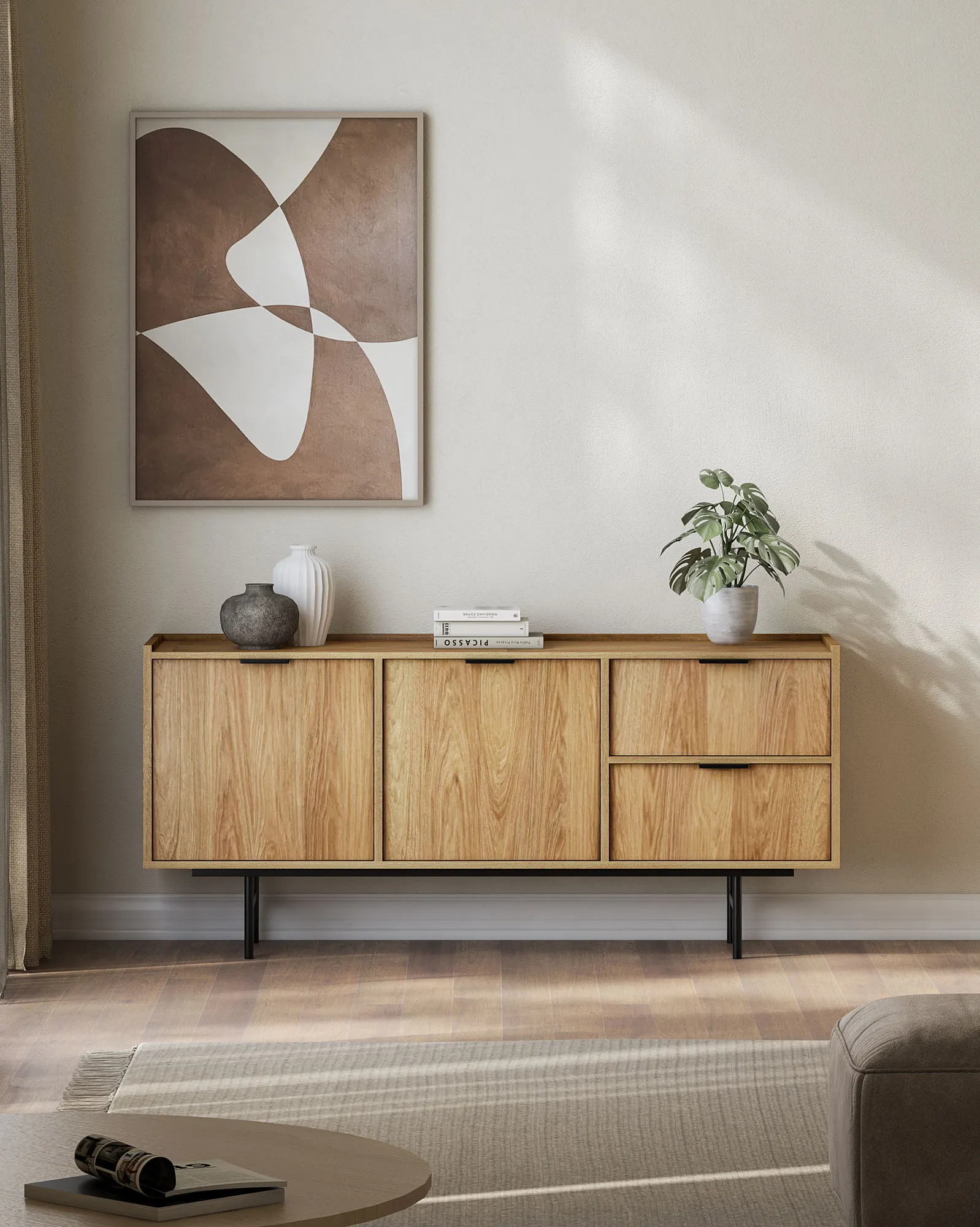 Przykładowa aranżacja z wykorzystaniem komody Herioz 5X hikora naturalna