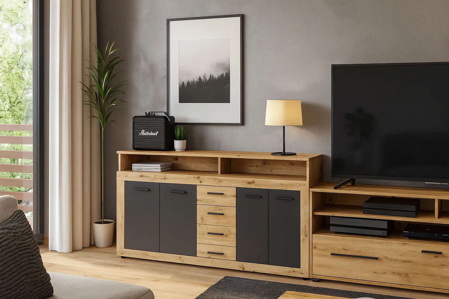 Łącząc dąb artisan z czarnym akcentem, uzyskano ciekawy kontrast. Montaż był prosty, wszystkie części spasowane dobrze. Komoda po złożeniu ma stabilną sylwetkę i nie chwieje się nawet przy lekkim uderzeniu.