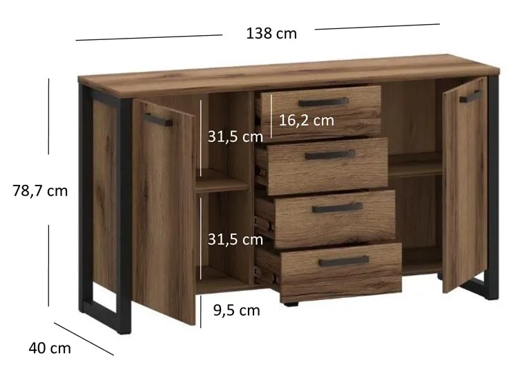 • Wymiary: szerokość: 138 cm, wysokość: 78,7 cm, głębokość: 40 cm.