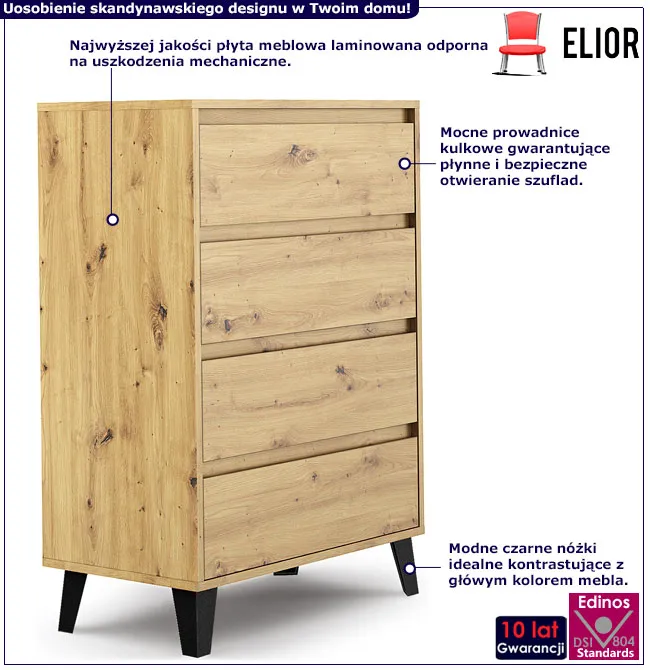Infografika komody z 4 szufladami na nóżkach dąb artisan Hallor 5X