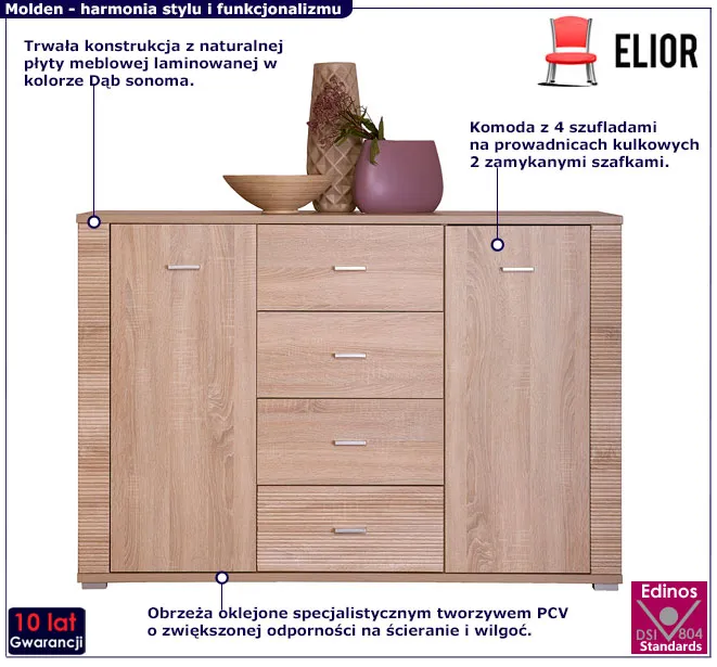 Kolekcja Molden od Elior to zaproszenie do stworzenia wnętrza, w którym dominuje spokój, harmonia i bliskość natury. Niezależnie od tego, czy aranżujesz salon, sypialnię, czy gabinet - Molden wprowadzi do Twojego domu ciepło natury i nowoczesny design. Nie czekaj, zamów jeszcze dziś komodę Donet 5X, a dostaniesz ją w atrakcyjnej cenie 898 zł. Postaw na minimalizm, który inspiruje, funkcjonalność, która ułatwia życie i styl, który pozostaje ponadczasowy. Postaw na komodę Donet 5X już teraz!