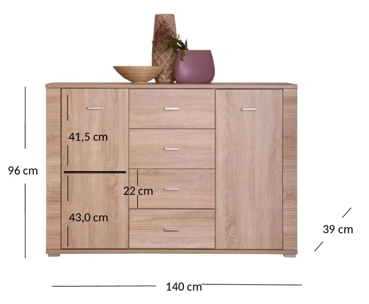 • Wymiary: wysokość: 96 cm, szerokość: 140 cm, głębokość: 39 cm.