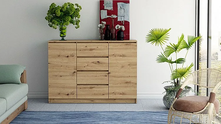 Minimalistyczna komoda Intia wyróżnia się nie tylko wysoką funkcjonalnością i atrakcyjnym designem, wykonano ją także z dokładnie wyselekcjonowanych materiałów. Użyta do jej produkcji laminowana płyta meblowa w kolorze dąb artisan została uszlachetniona cienkimi filmami melaminowymi. Posiada także specjalne włókna ułożone różnokierunkowo o strukturze sinusoidalnej, co zapewnia nadanie jej cech jakościowych oraz wytrzymałościowych. Zastosowana technologia sprzyja utrzymywaniu mebla w czystości. Dla zwiększenia wytrzymałości i trwałości komody, obrzeża szafki wykończono odpornym na uszkodzenia mechaniczne tworzywem PCV.